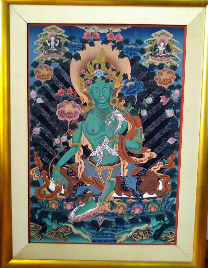 This thangka of Green Tara was painted by the renowned master lama/artist Dorje Lama Rinpoche in Lhasa, Tibet in 1988, he has since passed on to the Pure Land. Green Tara 'The Saviouress' manifest from a lotus born from a tear of the God of Compassion 'Avalokiteshvara'. Tara is the 'Mother of all Buddhas'. She liberates all sentient beings from fear and ignorance. She is the 'Divine Feminine' deity who heals the mind and body of all those who seek her grace. This rendition exhibits the devotion of a high lama who spent his life meditating upon her image. Beautifully framed. Price: B25,000 firm, no reduction. 32x42 inches Purchased in Lhasa, Tibet in 1988.