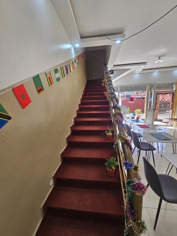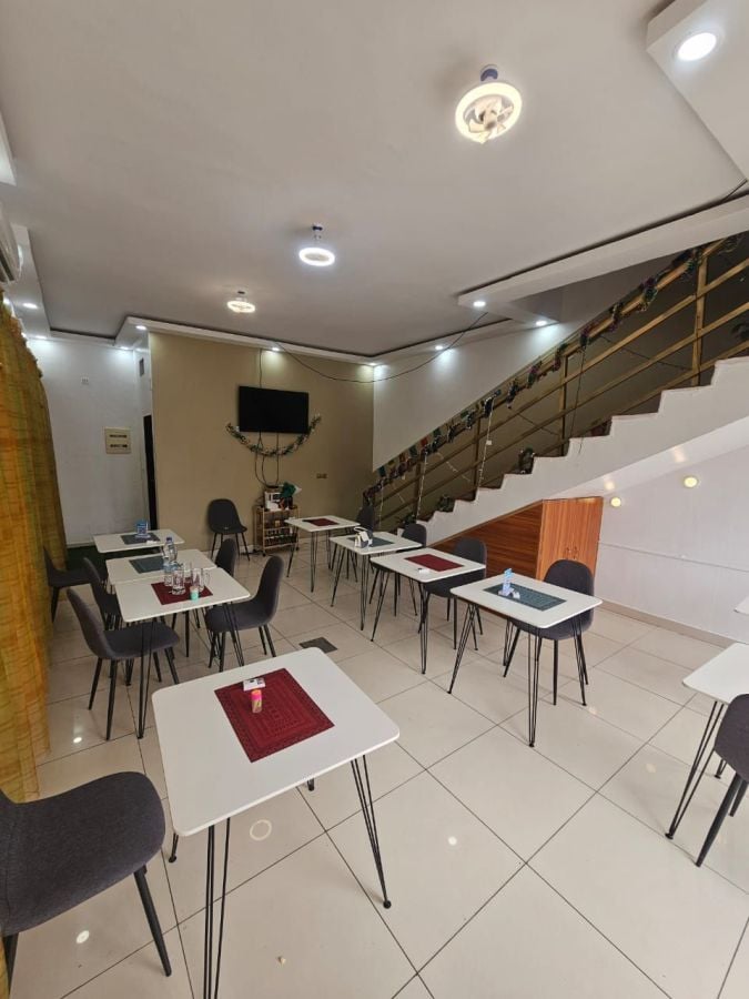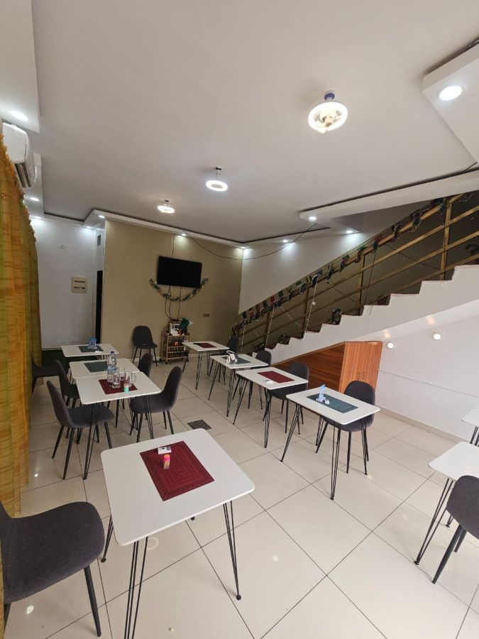 Restaurant-lounge, cadre à deux niveaux rez-de-chaussée et un étage avec un petite terrasse, en bordure de voie situé à Cocody riviera 2 rue Alpha Blondy dans l'immeube de la Radio Alpha Blondy FM