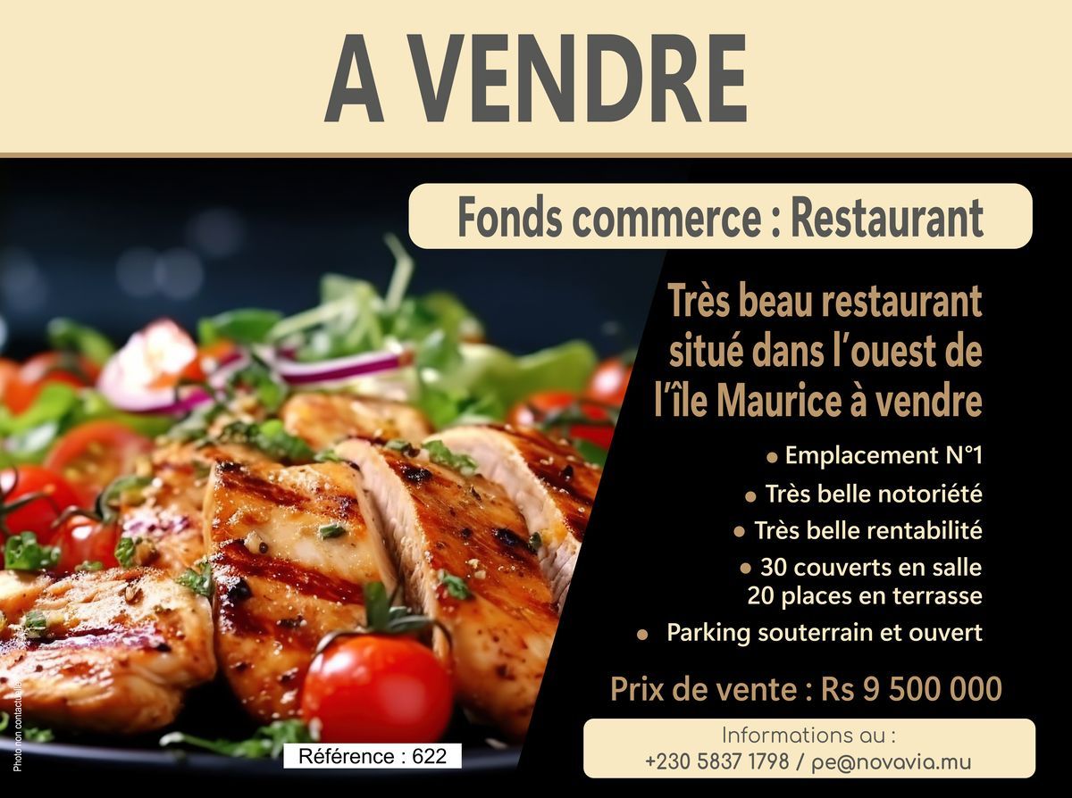 Très belle opportunité à saisir, accessible aux étrangers souhaitant s'installer sous le soleil de l'île Maurice. A vendre, fond de commerce d'un restaurant, situé à l'ouest de l'île Maurice dans un secteur à forte concentration d'expatriés et de touristes. Fort potentiel de développement en ouvrant les midi. L'établissement est très réputé avec une excellente notation sur Tripadvisor et Google. Le restaurant est en pleine activité avec possède toutes les licences d'exploitation à jour. Terrasse ombragée de 20 couverts + 30 couverts en salle. Mezzanine pouvant contenir 20 couverts supplémentaires. Parking Vente pour cause départ à la retraite. Bien accessible aux étrangers et donnant accès a un permis de résidence (permis investisseur) Référence 622 Prix de vente Rs 9 500 000 Frais d'agence 2% + VAT. Pour plus d'informations contactez le GROUPE NOVAVIA au +230 5837 1798 (WhatsApp) ou par mail à : pe@novavia.mu