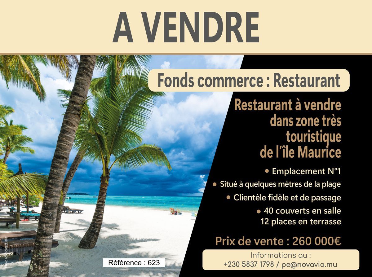Très belle opportunité à saisir, accessible aux étrangers souhaitant s'installer sous le soleil de l'île Maurice! A vendre fond de commerce d'un restaurant en pleine activité situé dans le nord de l'île Maurice à quelques mètres de l'une des plus belles plage de l'île et dans une zone très touristique. Etablissement très réputé et classé N°1 sur TripAdvisor. L'établissement dispose d'une décoration moderne et de toutes les licences d'exploitation à jour. 40 couverts en salle + 12 places à l'extérieur. Vente pour cause de départ à la retraite. Bien accessible aux étrangers et donnant accès a un permis de résidence (permis investisseur) Prix de vente Rs 13 000 000. Frais d'agence 2% + VAT Référence 623 Pour plus d'informations contactez le GROUPE NOVAVIA au +230 5837 1798 (WhatsApp) ou par mail à : pe@novavia.mu
