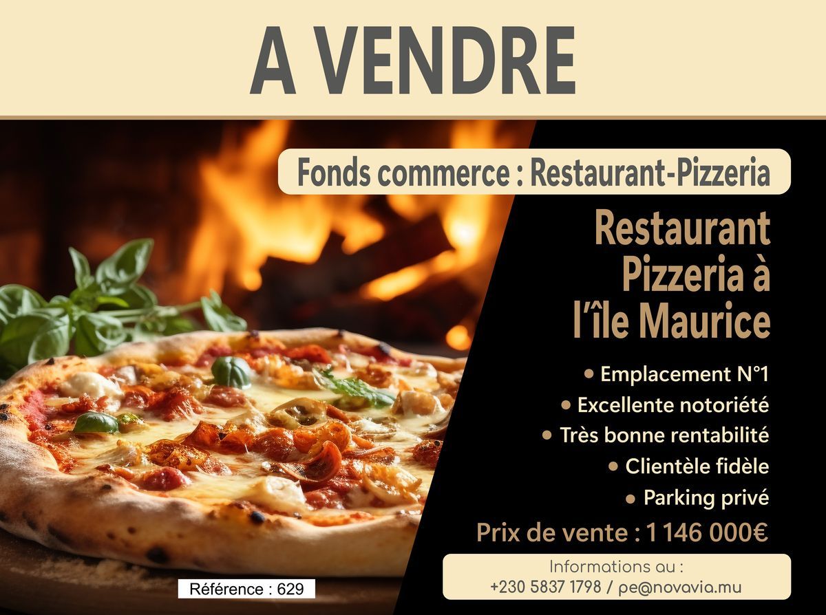 A vendre, fond de commerce d'un restaurant-pizzeria de renom située à l'ouest de l'île Maurice. Affaire très rentable avec un chiffre d'affaire en constante progression. L'établissement est très réputé et est composée d'une clientèle fidèle (locaux, expatriés et touristes). Le restaurant est en pleine activité et possède toutes les licences d'exploitation à jour. Terrasse ombragée de 24 couverts + 100 couverts en salle. A 100m : 1 parking privé + 1 rôtisserie appartenant au restaurant. Inclus dans la vente : 3 véhicules Bien accessible aux étrangers donnant accès à un permis de résidence (permis investisseur) Référence 629 Vente pour cause de départ à la retraite. Prix de vente 1 146 000€ négociable Frais d'agence 2% + VAT Pour plus d'informations contactez le GROUPE NOVAVIA au +230 5837 1798 (WhatsApp) ou par mail à : pe@novavia.mu