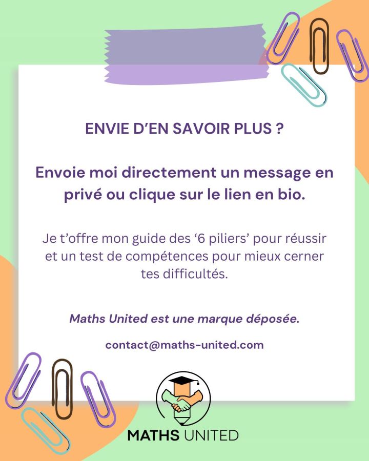 Je propose des cours particuliers de maths niveau collège / lycée pour les élèves scolarisés dans le système français. Un suivi complet de progression sera mis en place et des bilans réguliers seront effectués afin d'atteindre les objectifs que l'on se sera fixés. Vous aurez accès illimité à toutes les ressources du site Maths United. Si vous souhaitez en savoir plus, n'hésitez pas à me contacter. Bonne rentrée à tous !
