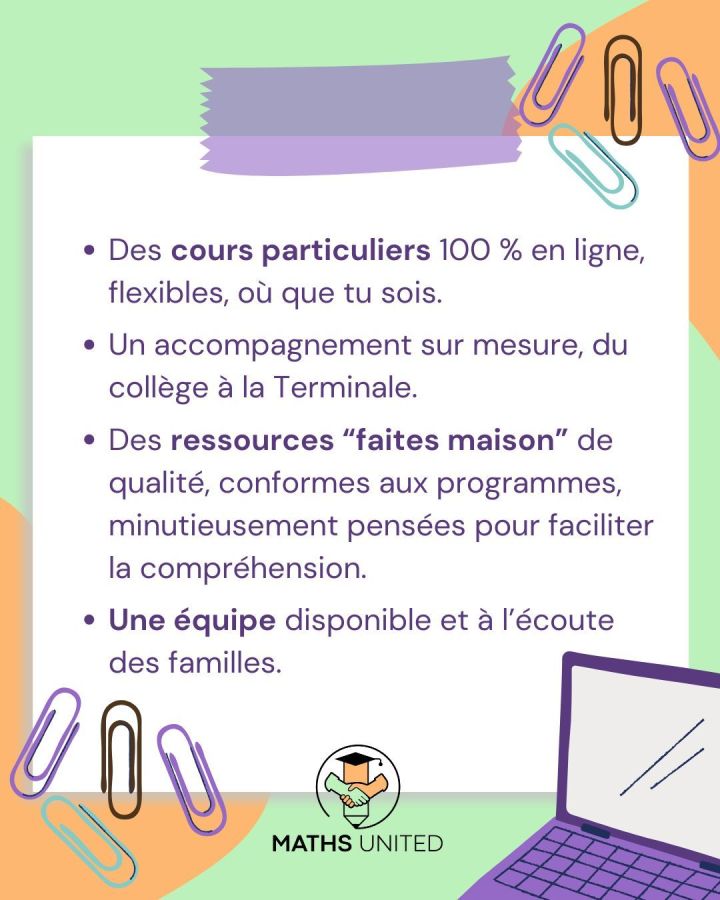 Ancien ingénieur, je suis maintenant prof de maths. Je propose des cours particuliers en ligne et des stages de révision intensifs en présentiel (Beau Plan) tout au long de l'année. Pour tous les élèves du système français au collège et au lycée. N'hésitez pas à me contacter pour plus d'informations. Vous pouvez également consulter ma plateforme www.maths-united.com À bientôt !