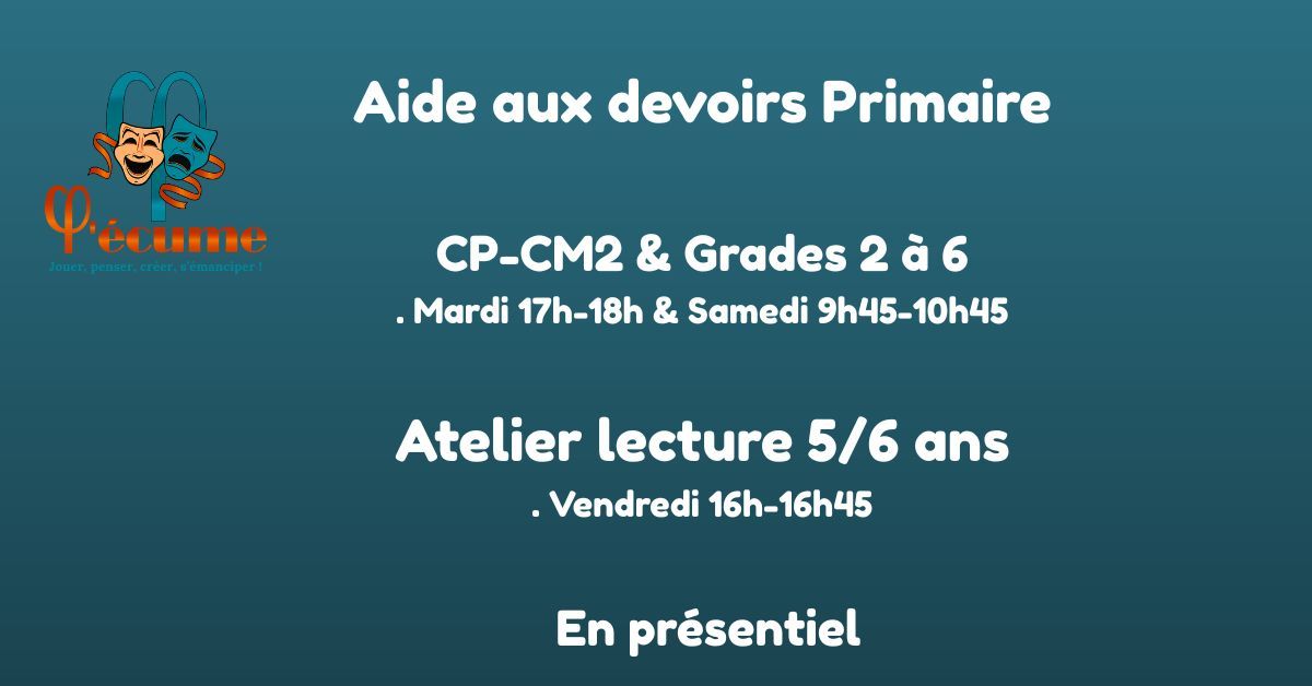 2026 : Nouvelle année, nouvelles formules, nouveau lieu ! Les ateliers de l'écume quittent Albion et s'installent à Tamarin. Des nouveaux cours, en ligne, de l'aide aux devoirs, un atelier philo-dessin, des préparations au Bac de français et au Bac de Philo & spécialité HLP pour les lycéens, préapration au Brevet des collèges (DNB) et un nouveau club créatif destiné aux adultes, actifs et retraités. Bien-sûr, toujours des consultations EFT sur RDV Visitez le site pour toutes les infos sur les inscriptions, horaires et tarifs : www.ateliersdelecume.com