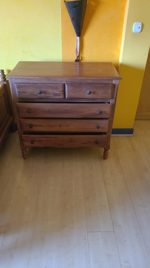 Commode en bois massif avec 5 tiroirs spacieux. Solide et pratique, idéale pour chambre ou rangement. Très bon état général A venir récupérer sur place.