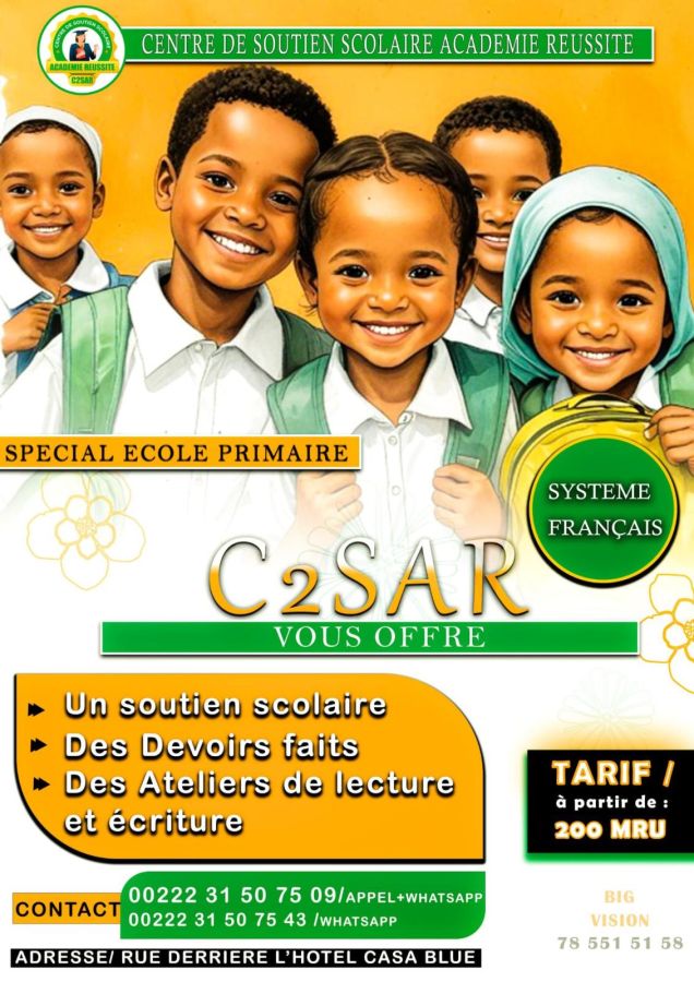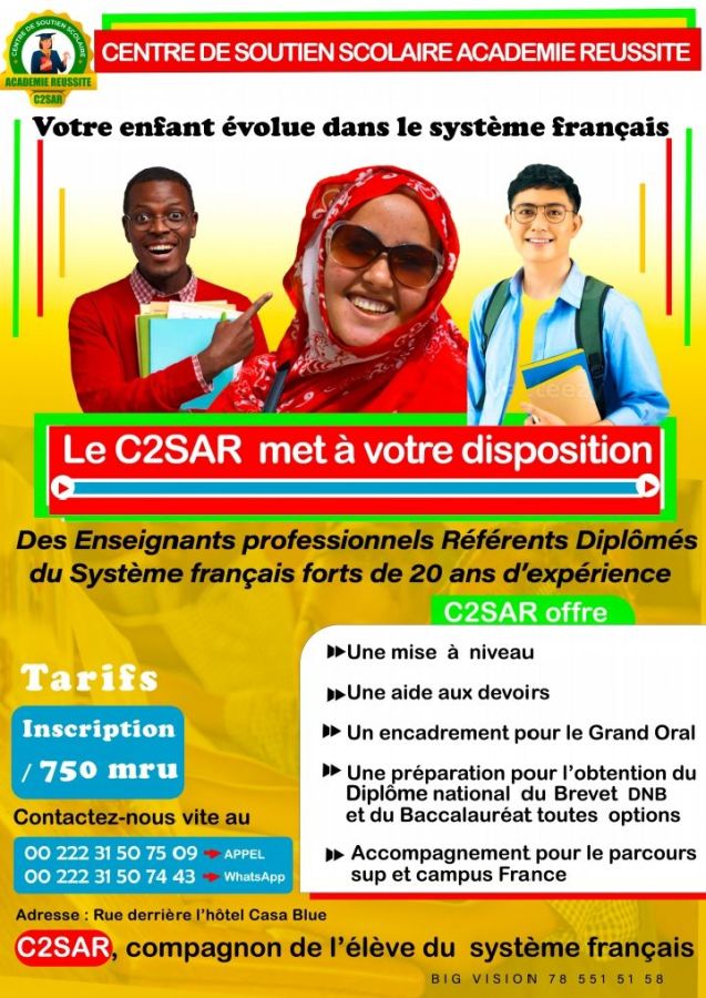 Le C2SAR est un centre de soutien scolaire à destination de l'enseignement du système français, en Mauritanie. Composés d'enseignants certifiés, nous intervenons sur notre site pour les élèves de l'école primaire au lycée