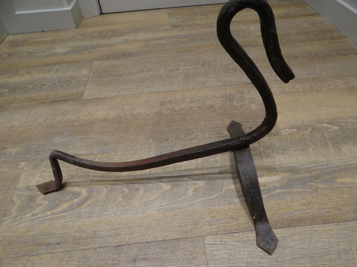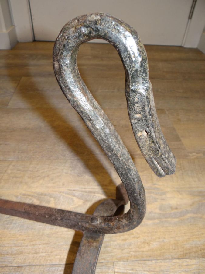 bon état pour cette paire de chenets , travail artisanal, fer martelé, têtes de cygnes, très élégant ,dim long 49 cms,hauteur 35 cms,largeur des pieds 32 cms ...possibilite envoi france metro