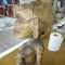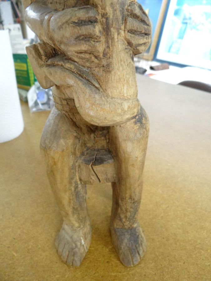 Statue africaine de Côte d¿Ivoire, femme et enfant, mère allaitante, sculpture en bois,profondes fissures de séchage du bois. Taille : 54 cm de hauteur.