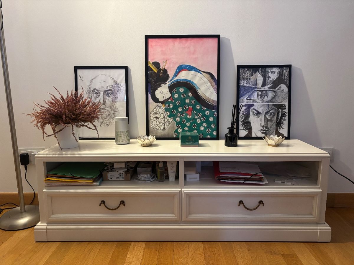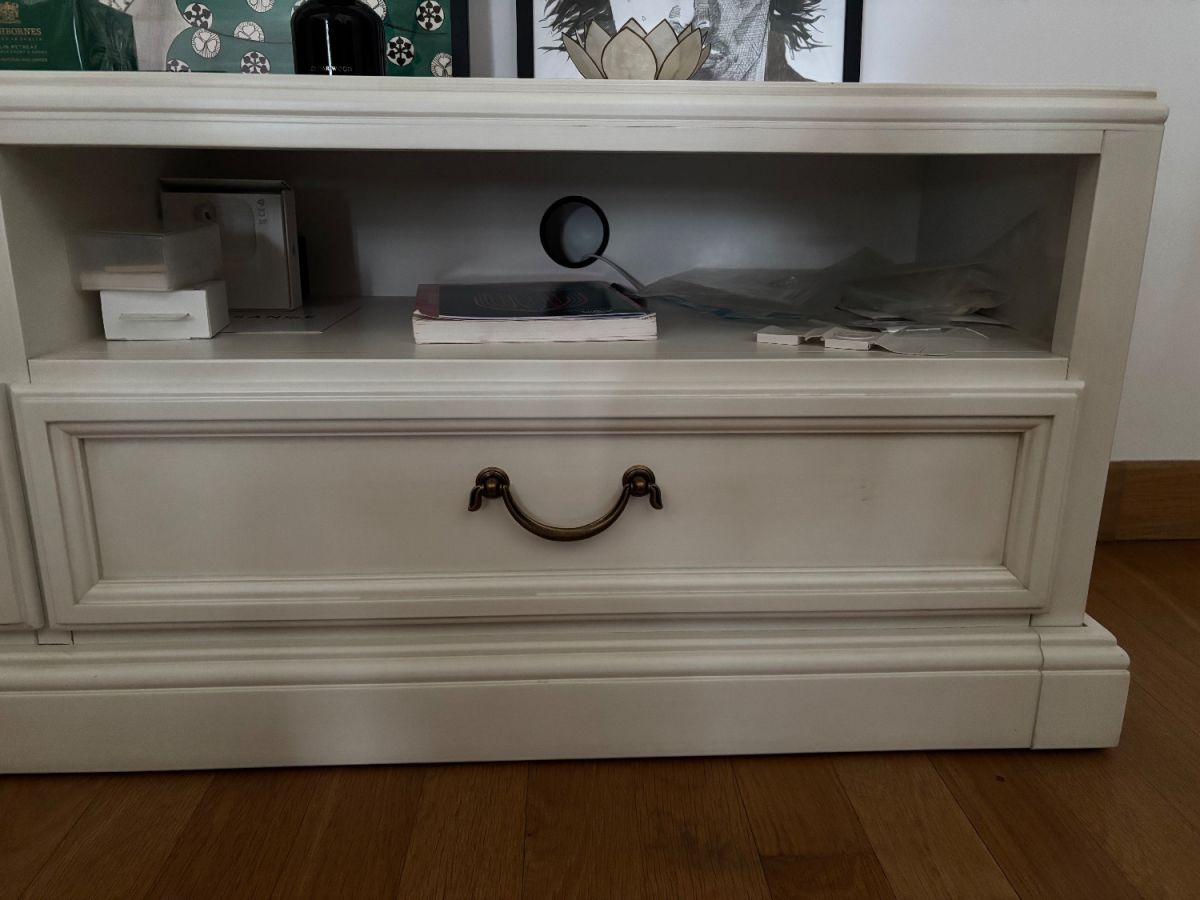 Caractéristiques : Dimensions : 145 cm (L) x 40 cm (P) x 44cm (H) Couleur : Blanc élégant 2 compartiments ouverts pour rangement (livres, déco, électronique) 2 tiroirs fermés avec poignées bronze dorée design Base solide et stable Style moderne et épuré Points forts : ✅ Excellent état général ✅ Parfait pour TV jusqu'à 55-65 pouces ✅ Rangements pratiques et fonctionnels ✅ Design intemporel qui s'adapte à tous les intérieurs ✅ Meuble solide et de qualité Idéal pour : Support TV dans salon ou chambre Rangement multimédia (box, console, livres) Décoration avec objets et cadres À récupérer sur place - Immueble avec élévateur spacieux Cause de la vente : déménagement