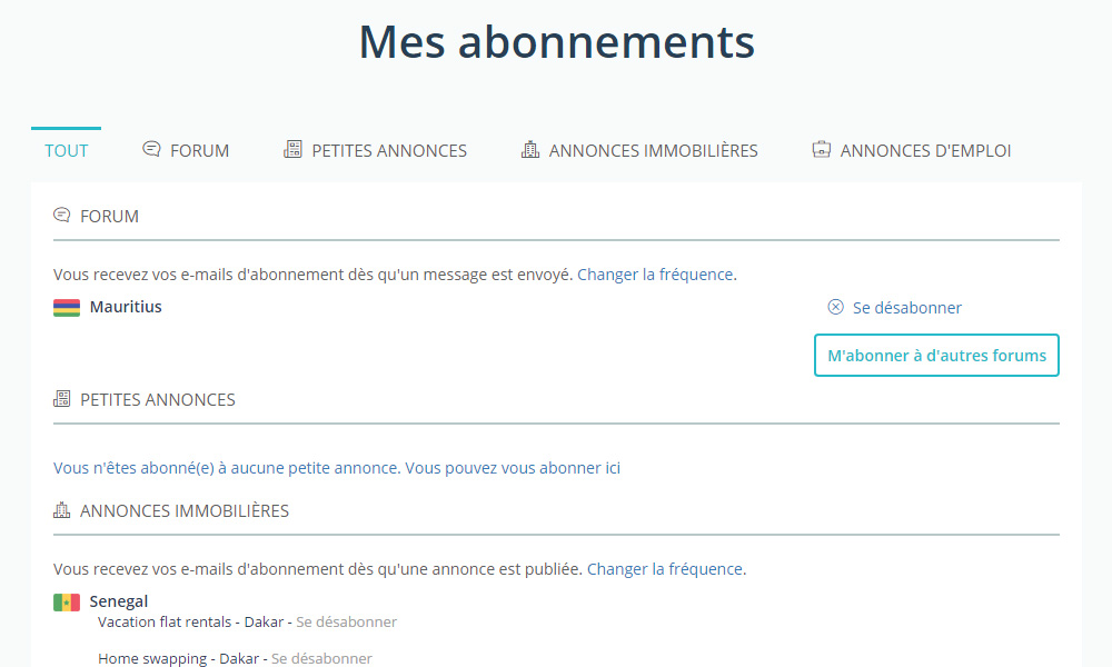Vous pouvez gérer vos abonnements depuis votre page Profil, onglet « Abonnements ». Vous aurez accès à un récapitulatif des forums et discussions auxquels vous avez souscrit. Vous avez également la possibilité de vous abonner à de nouveaux forums ou bien de vous désabonner de certains forums ou discussions.