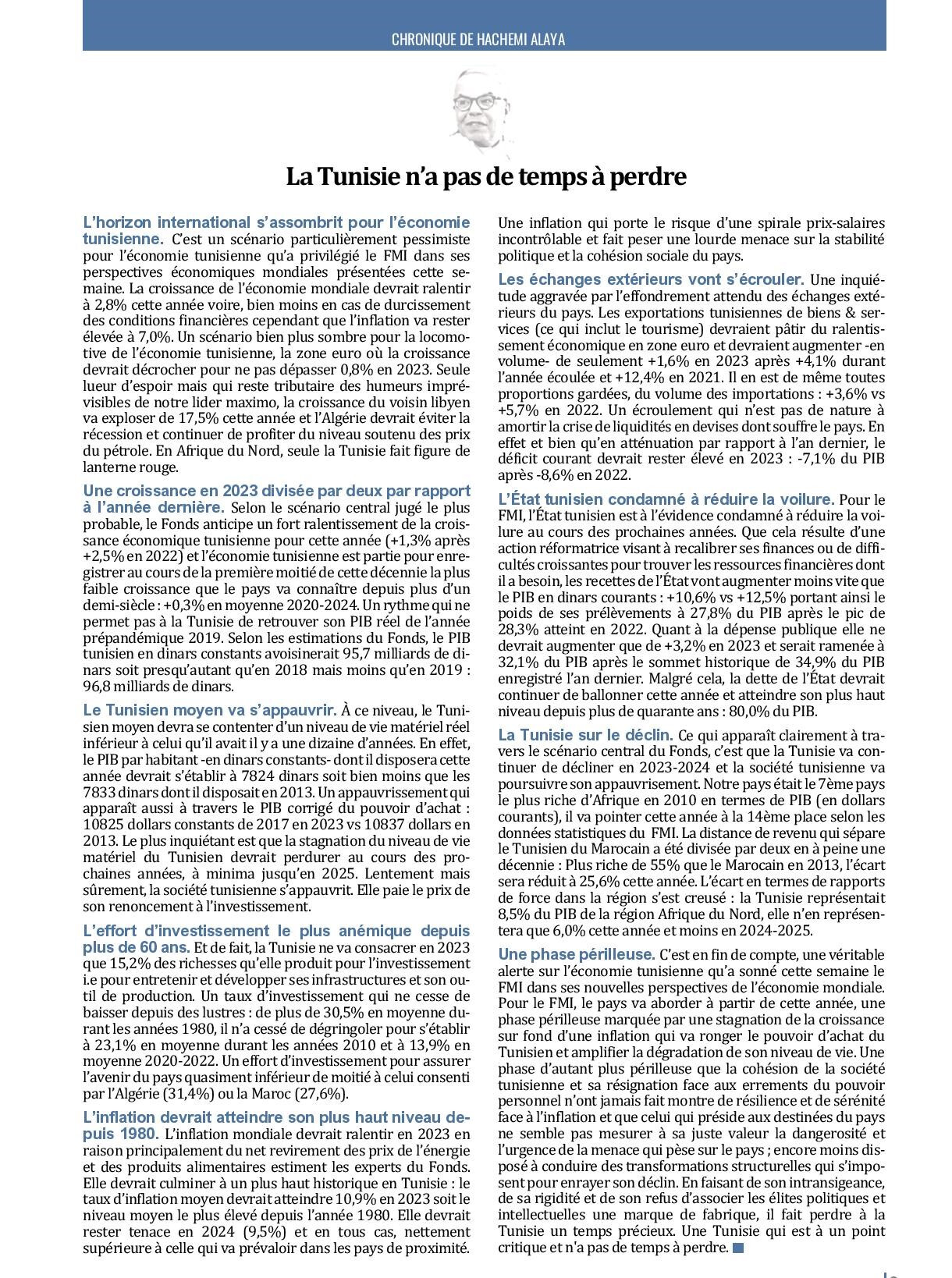 En ce qui concerne les négociations avec le FMI, tout laisse à penser qu'il faut rester optimiste et qu'un accord sera trouvé, avec de la patience, pour aider notre pays ami, la Tunisie, en respectant de ne pas mettre en place un programme menaçant sa stabilité (clause exprimée aussi par l'Italie) :