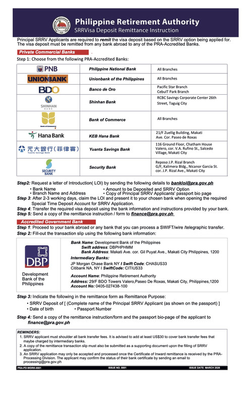 Ouverture de compte / dépôt des 15000 USd pour visa SRRV